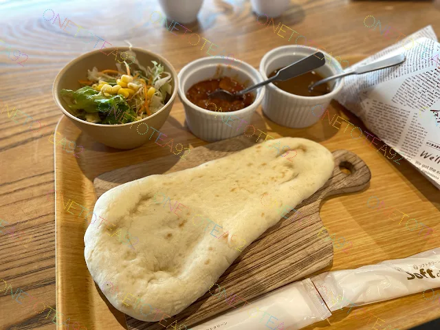 เราสั่งมาเป็นโรตีนาน แป้งร้อนๆ ด้านนอกหนา ด้านในนุ่ม กินคู่กับซอสแกงกะหรี่ และแกงอะไรอีกสักอย่างอร่อยดี